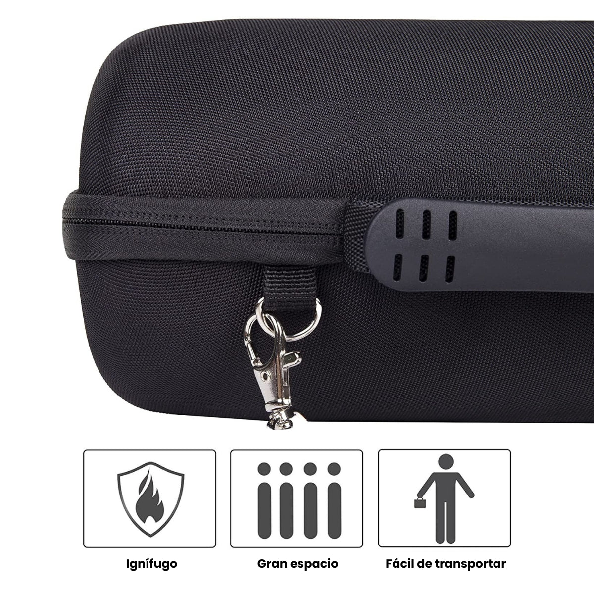 Este estuche rígido te permite estar tranquilo durante tus actividades diarias y aventuras, como viajes o salidas, pues mantiene tu parlante en todo momento seguro contra rayones, golpes, presión, polvo y agua. El estuche se encargará de que te olvides de las preocupaciones que suponen cargar con tu parlante, pues por su material resistente e impermeable por fuera y acolchonado por dentro no dejará que le pase nada a tu parlante.
