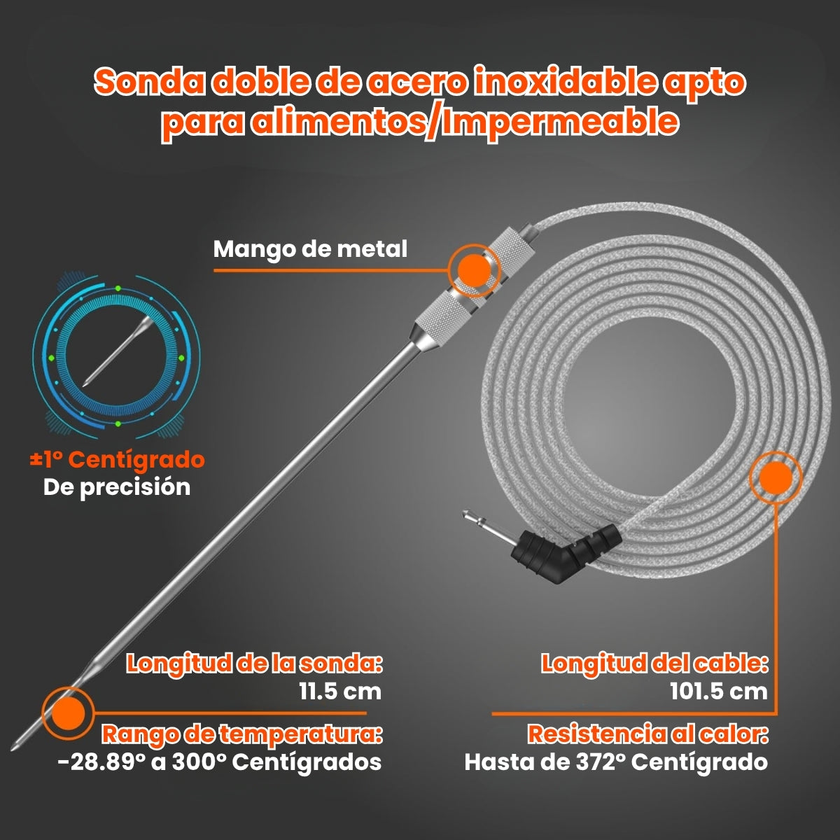 En su bella pantalla LCD tiene temporizador integrado y una alarma que sonará cuando la sonda alcance a temperatura establecida o la cuenta regresiva se acabe. Incluye dos sondas de acero inoxidable de alta precisión, lo que permite una penetración profunda y lecturas precisas en diferentes cortes y preparaciones, este se conecta a el termómetro por un cable de malla de acero diseñado para resistir cualquier ambiente de cocción para un uso duradero. Además, cuenta con una batería recargable que por carga ofrece hasta seis meses de uso
